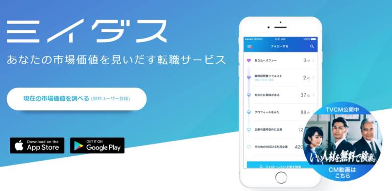ミイダスは、書類選考合格済みの「面接確約オファー」だけが企業から直接届く、唯一のスカウト式転職支援サービスです。